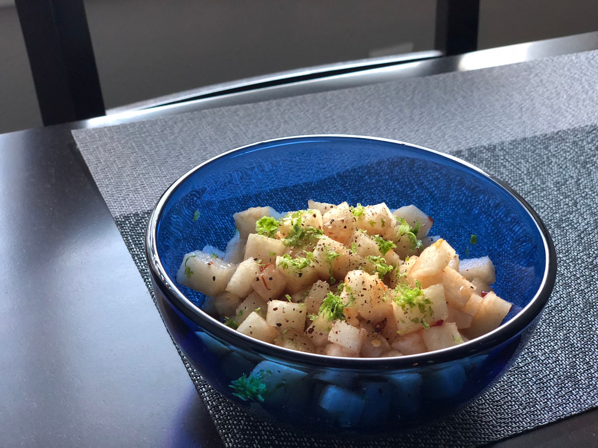 When it comes to cooking it myself, I wanted to try to come up with two quick recipes that highlighted jicama in two very different forms — one savory and one sweet. Jicama has notes of both of these in its raw form — it is a vegetable and feels like one, but also has the mealy interior reminiscent of an apple.