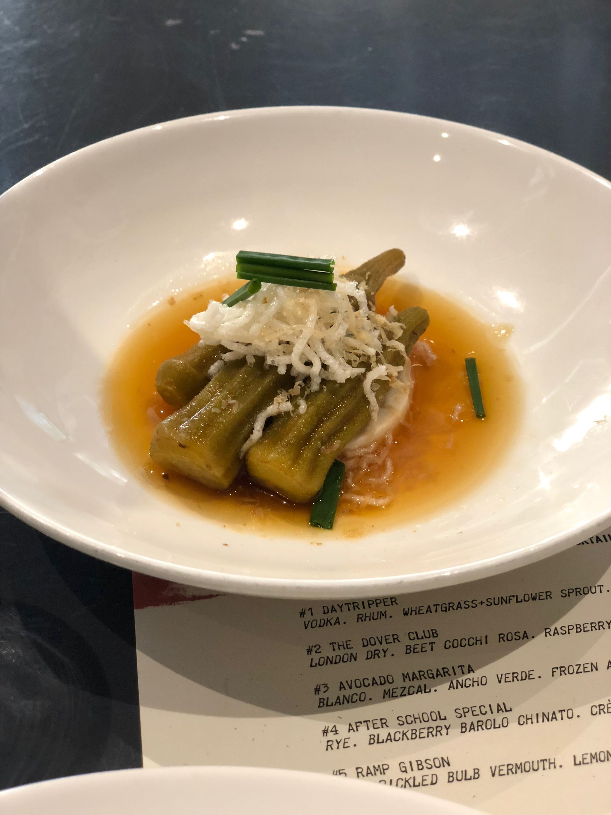 I'm a big okra fan always, and the take on it here was really exciting. The okra itself surged with flavors of dashi (a Japanese fish stock made with kelp and dried, fermented tuna flakes), but was rounded out really well by the acidity in the tomato broth.