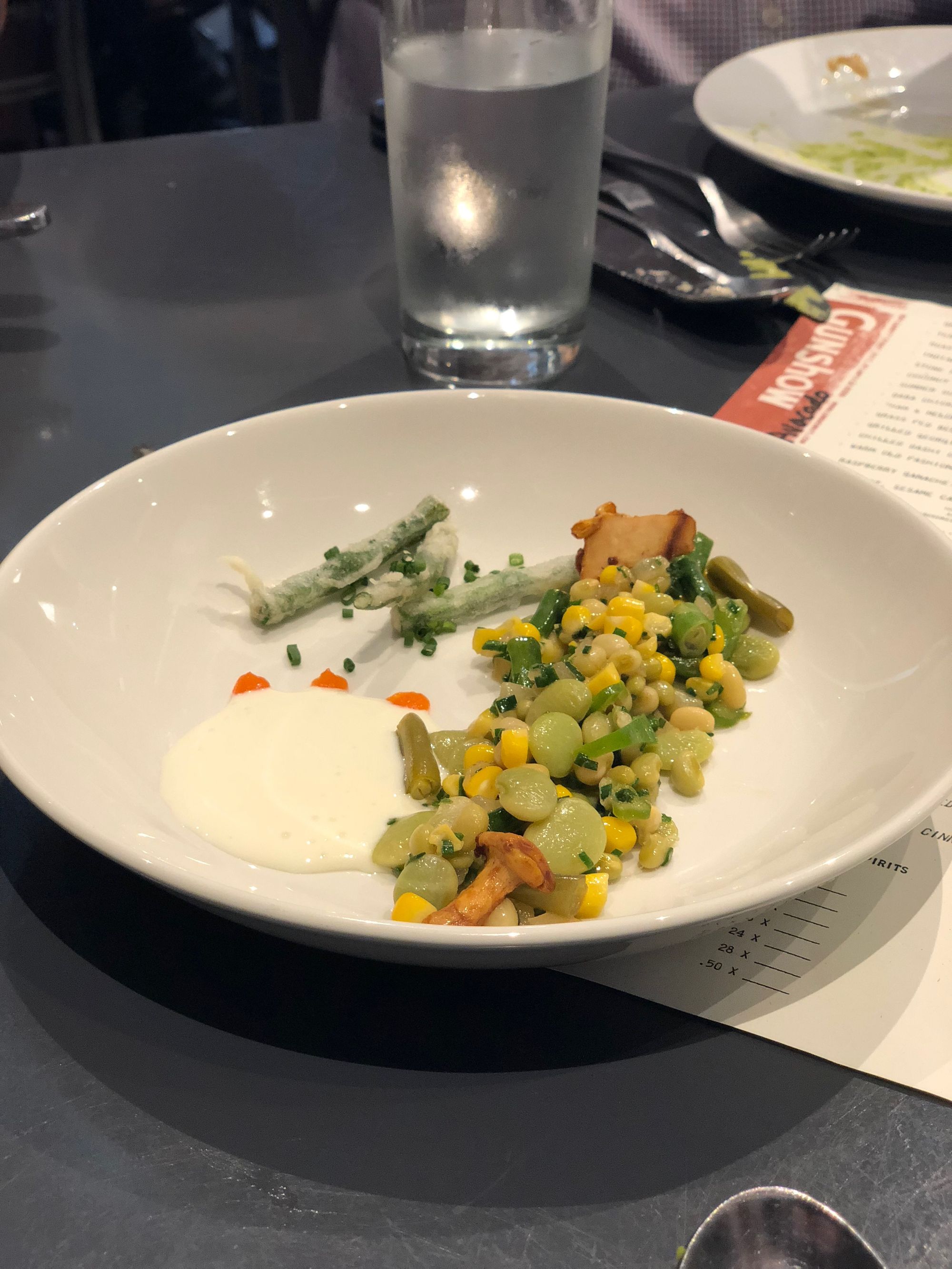 What a take on succotash! In heritage American cooking (in my home state of Pennsylvania, New England and in the South as well), succotash is typically a mix of lima beans, corn and some other vegetables. At Gunshow, they pay homage to that with those two elements, but add some chanterelle mushrooms and serve it alongside lightly-tempura-fried pickled green beans and a whipped pimento cheese. This dish worked best when you got a little bit of everything together.